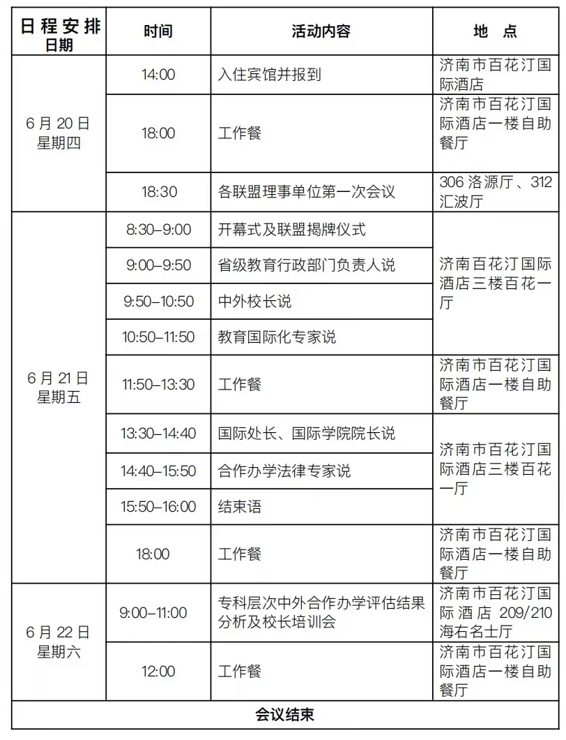 6月20日下午报到,晚上召开相关联盟议事会议;6月21日举行各联盟揭牌仪式,与会专家报告;6月22日上午山东省专科层次中外合作办学评估结果分析及中外合作办学校长培训会(凡参加今年专科层次评估学校的分管校领导及中外合作办学负责人均应参会)。