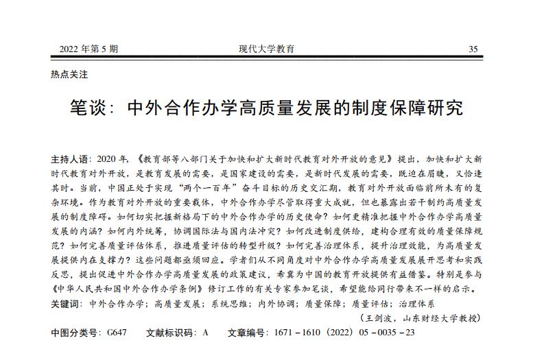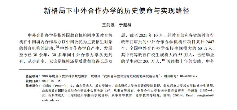 山东省教育国际交流与合作研究中心常务副主任王剑波教授作主持人语,并在笔谈中发表《新格局下中外合作办学的历史使命与实现路径》,是“山东省教育国际交流与合作研究中心”取得的重大学术成果,研究中心将不断加强学术研究,促进成果转化。